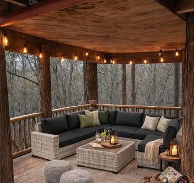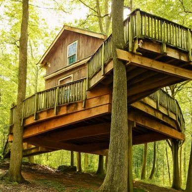 The Aliyah Treehouse, built in 2016 by Django of Canopy Crew. He brought my dream treehouse to life with artistic craftsmanship. Featuring a tree in the living room, it stands as the tallest treehouse on the property, complete with two cabins for a unique and immersive experience.