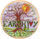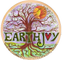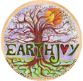 This photo shows a cozy, inviting outdoor scene at EarthJOY Village. In the foreground, there is a large circular web swing made of sturdy rope and a padded blue edge, suspended securely between tall trees. The ground is covered in fallen autumn leaves, adding a warm golden glow to the scene. In the background, partially nestled among the trees, is your charming wooden treehouse with a peaked roof